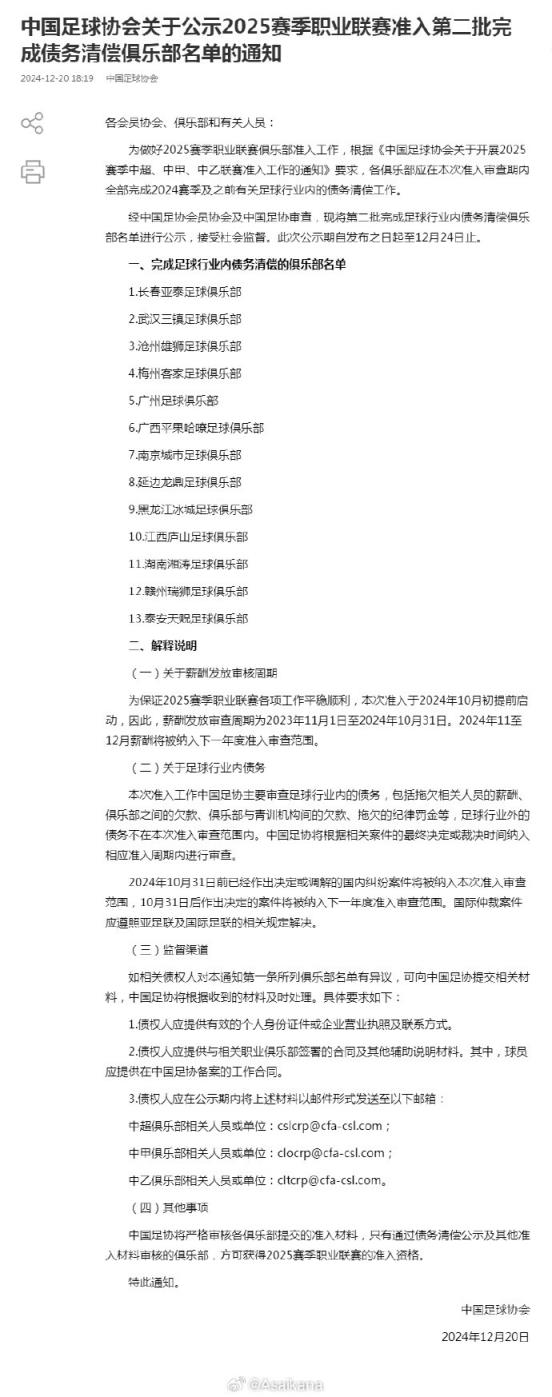 中國(guó)足協(xié)公示2025賽季職業(yè)聯(lián)賽準(zhǔn)入第二批完成債務(wù)清償俱樂(lè)部名單,此前不在第一批名單里的長(zhǎng)春亞泰、武漢三鎮(zhèn)、滄州雄獅、梅州客家、廣州、廣西平果哈嘹、南京城市、延邊龍鼎、黑龍江冰城、江西廬山、湖南湘濤、贛州瑞獅、泰安天貺全員上榜,相當(dāng)于所有三級(jí)職業(yè)俱樂(lè)部都進(jìn)行了完成債務(wù)清償?shù)墓尽????