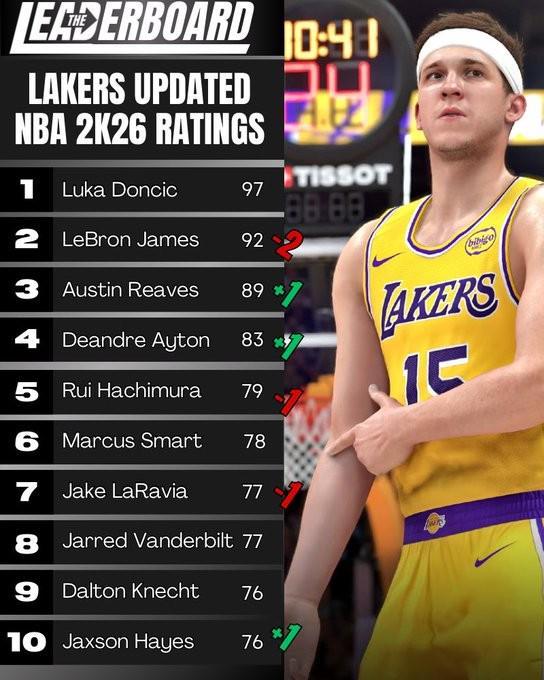 湖人隊其他球員中,東契奇保持97分仍為全隊最高,里夫斯和艾頓各加1分分別為89和83分。八村壘和拉拉維亞各降一分,杰克遜-海耶斯?jié)q了1分。